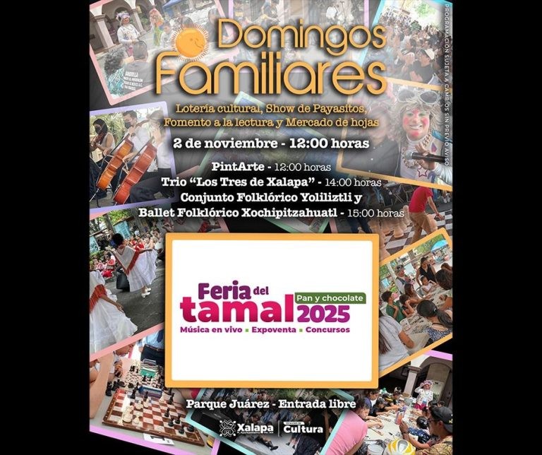 A la misma hora, como parte del programa “Apantallarte Itinerante”, se proyectará la película “El Libro de la vida”, en el auditorio de la IMAC. El domingo 2 de noviembre culminará la Feria del Tamal, Pan y Chocolate 2025 con la programación de “Domingos Familiares”.