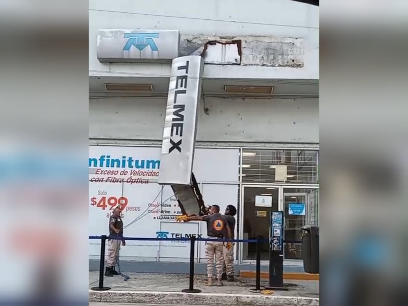 Las fuertes rachas del evento de Norte que desde la madrugada azotan al norte del estado provocaron la caída parcial de un letrero metálico de Telmex en pleno centro de la ciudad, lo que generó la rápida movilización de los cuerpos de rescate.
