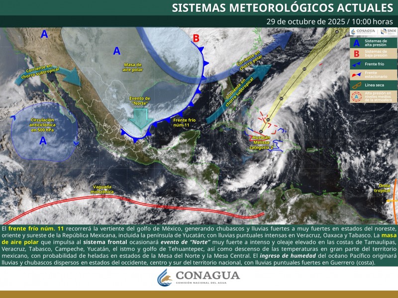 El frente frío núm. 11 se extenderá sobre la península de Yucatán, originando chubascos y lluvias fuertes en dicha península y en el sureste mexicano. La masa de aire polar que impulsa al sistema frontal mantendrá el descenso de las temperaturas sobre el norte, centro y oriente del país; con presencia de heladas en los estados de la Mesa del Norte y la Mesa Central. Así mismo, prevalecerá el evento de “Norte” con rachas de viento de 80 a 90 km/h en Oaxaca y Chiapas (istmo y golfo de Tehuantepec), y de 50 a 60 km/h en las costas de Tamaulipas, Veracruz, Tabasco, Campeche, Yucatán y Quintana Roo (disminuyendo durante el día); además de oleaje de 3.0 a 4.0 metros de altura en el golfo de Tehuantepec; de 2.5 a 3.5 metros de altura en las costas de Veracruz y Tabasco (disminuyendo en el transcurso del día) y de 2.0 a 3.0 metros de altura en las costas de Tamaulipas, Campeche y Yucatán.