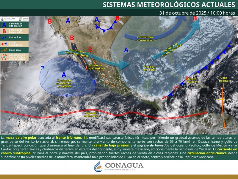 Un canal de baja presión sobre el occidente del país y el ingreso de humedad del océano Pacífico, golfo de México y mar Caribe, originarán lluvias y chubascos dispersos en estados del occidente, centro, sur y sureste del territorio nacional.
