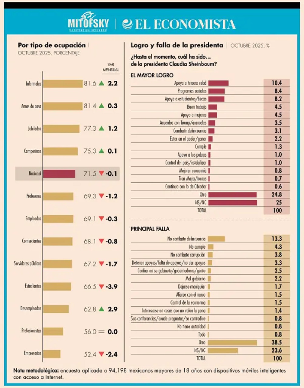 La encuesta nacional mensual sobre aprobación presidencial realizada por la empresa Mitofsky para El Economista revela que, dando por descontado a los morenistas y quienes votaron por ella, así como a los que no le dieron su voto y los panistas, ocho (81.6%) de cada 10 trabajadores informales avalan el desempeño de Sheinbaum, contra cinco (52.4%) de cada 10 empresarios.