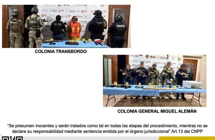 En el primer operativo, efectuado en la colonia Transbordo, se detuvo en flagrancia a Rosa María “N” y se aseguraron celulares, un arma de fuego, cartuchos balísticos, una sustancia granulada color blanco con características similares a las del cristal, un radio de comunicación, un cuchillo táctico y un dispositivo tipo laptop.