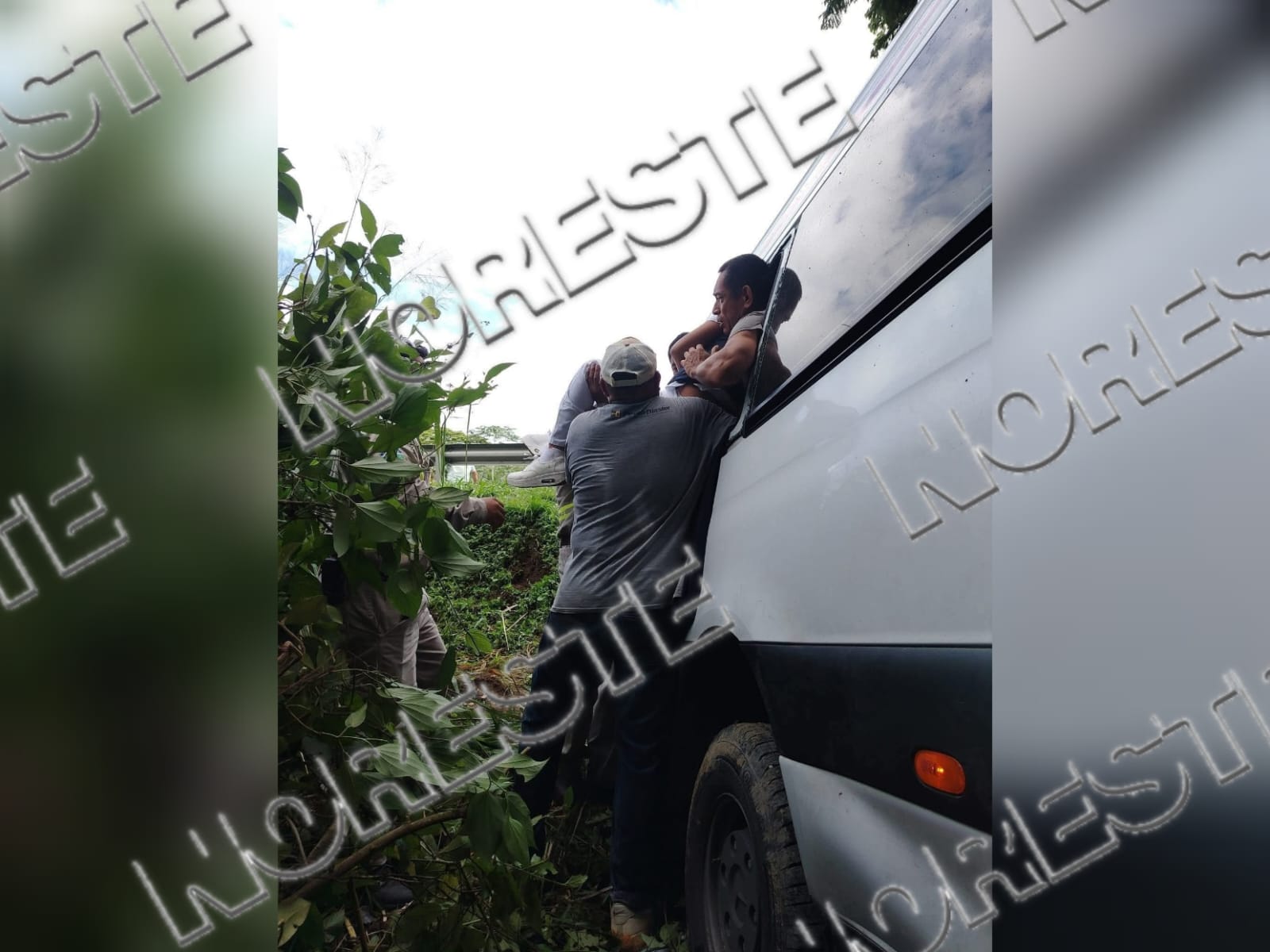 El percance ocurrió a la altura del kilómetro 26, poco después de las instalaciones de la empresa Madisa, cuando la unidad tipo Sprinter, que se dirigía hacia el municipio de Agua Dulce, se salió de la cinta asfáltica y terminó en una pendiente lateral.