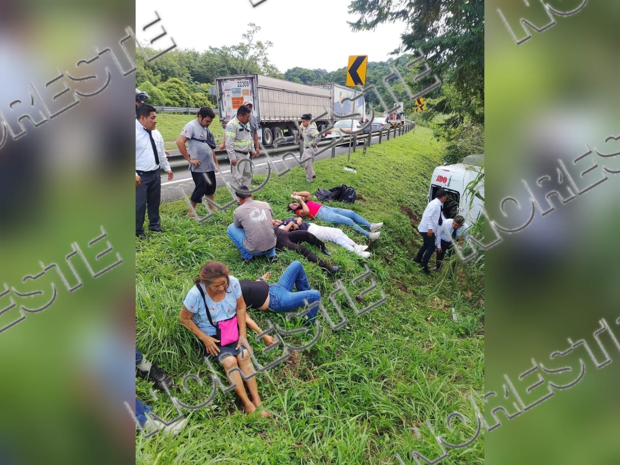 Varias personas resultaron lesionadas luego de que una camioneta de transporte de pasajeros perteneciente a la línea ADO sufriera un aparatoso accidente sobre la carretera federal 180, en el tramo Coatzacoalcos–Agua Dulce.