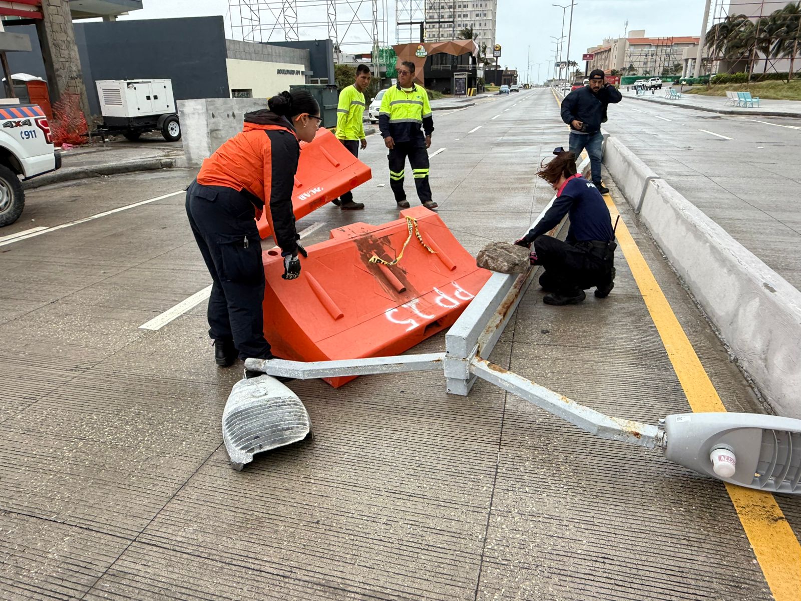 Debido a las fuertes rachas de viento generadas por el Frente Frío número 13, el poste que sostenía los reflectores se vino abajo, dejando parcialmente bloqueada una de las vialidades.