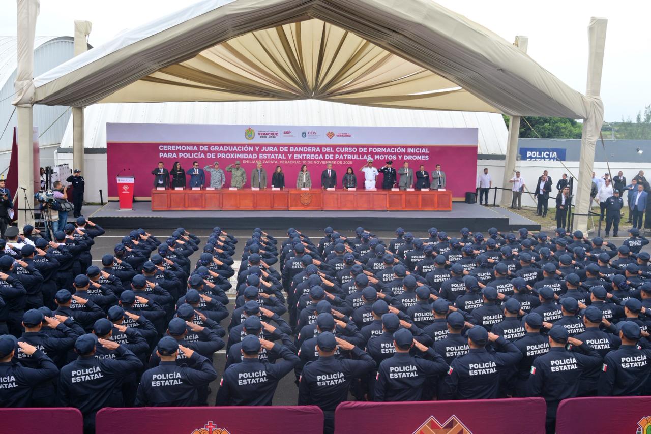 En representación de la LXVII Legislatura del Estado de Veracruz, la presidenta de la Mesa Directiva, diputada Naomi Edith Gómez Santos, acudió a la Ceremonia de Graduación y Jura de Bandera del Curso de Formación Inicial para Policía de Proximidad Estatal y Entrega de Patrullas, Motos y Drones, encabezada por la gobernadora de Veracruz, Rocío Nahle García. La inversión, que supera los 200 millones de pesos, fortalece las capacidades operativas de la fuerza policial e impulsa la Estrategia Estatal de Seguridad para mantener la paz en Veracruz.