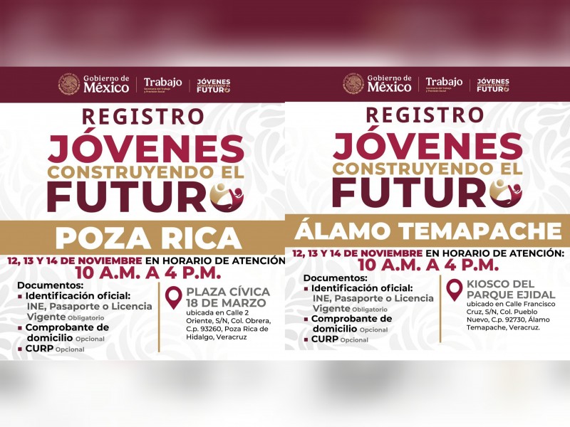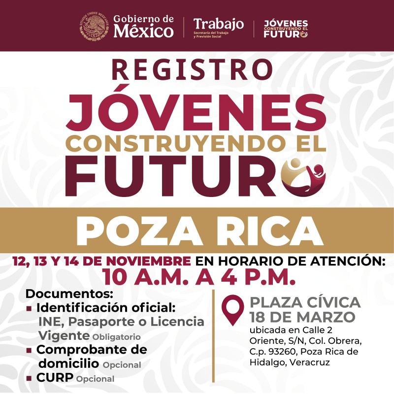 El Gobierno Federal y el Gobierno del Estado, a través de la Secretaría del Trabajo, invitan a las y los jóvenes veracruzanos a participar en el registro del programa “Jóvenes Construyendo el Futuro”, que se llevará a cabo del 12 al 14 de noviembre, en horario de 10:00 a 16:00 horas.