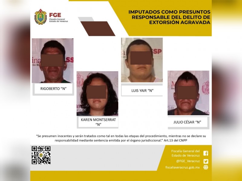 La Unidad Especializada en Combate al Secuestro y la Extorsión formuló imputación en contra de Karen Montserrat “N”, Rigoberto “N”, Luis Yair “N” y Julio César “N”, señalados como presuntos responsables del delito de extorsión agravada en agravio de una persona cuya identidad fue reservada por motivos de seguridad.