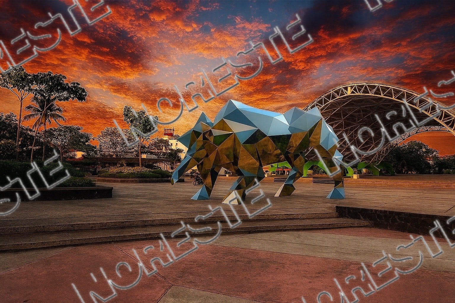 Forjada en acero inoxidable con un acabado platino de alto brillo, la escultura representa energía contenida y fuerza en movimiento. Sus líneas poligonales y superficies espejadas evocan el carácter trabajador y resiliente de la población pozarricense, reflejando tanto el entorno urbano como la esencia de una comunidad capaz de sobreponerse a la adversidad.