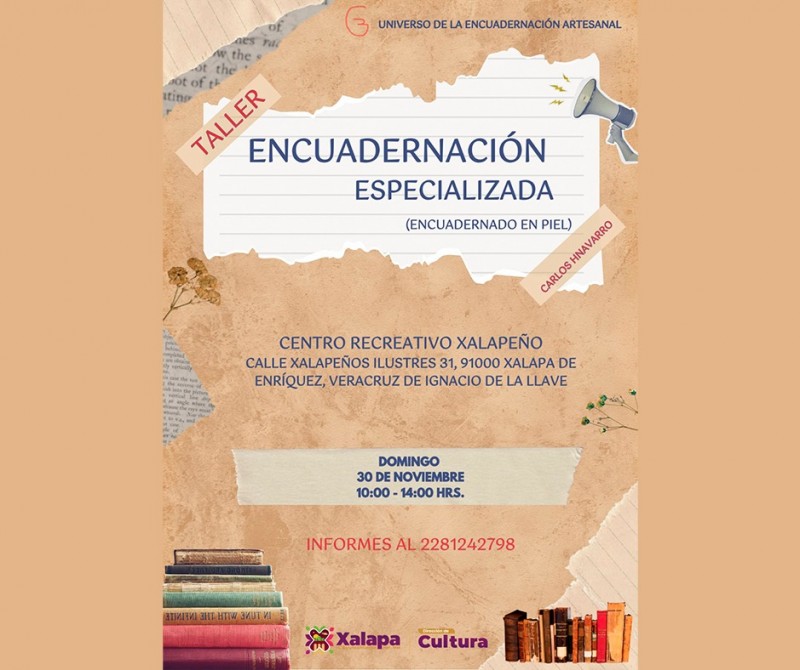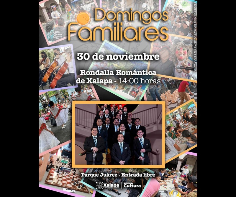 El domingo, a las 10:00 horas, en el CRX, iniciará el taller de Encuadernación Especializada, impartido por Carlos H. Navarro. A las 12:00 horas, en el Parque Juárez, se desarrollará el tradicional programa “Domingos Familiares”, seguido de la presentación de la Rondalla Romántica de Xalapa.