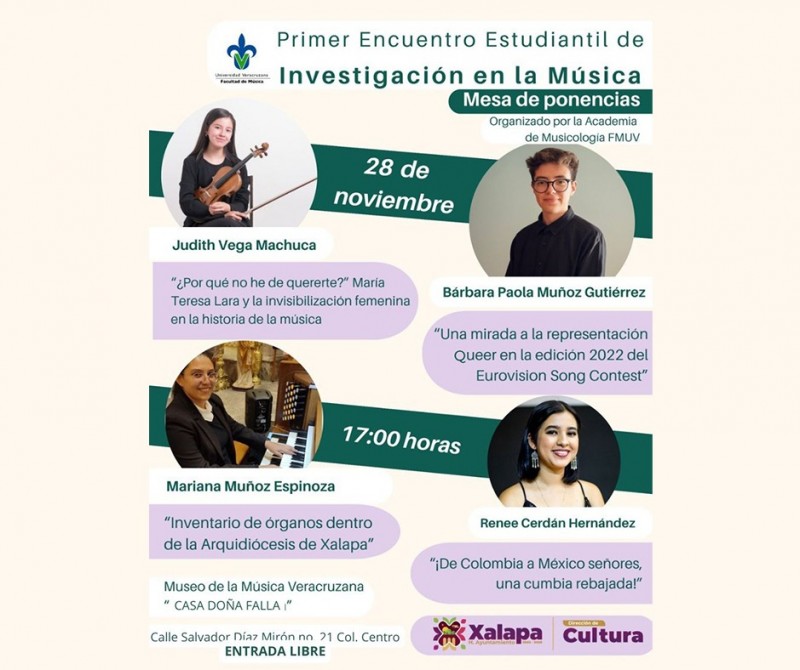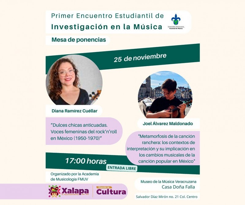 Este martes, a las 17:00 horas, en el Museo de la Música Veracruzana se llevará a cabo el Primer Encuentro Estudiantil de Investigación en la Música, con diversas ponencias; y en el Centro Recreativo Xalapeño (CRX), se presentará el libro “Bajo el sol, las flores crecen”, de María Félix Osorio Domínguez.