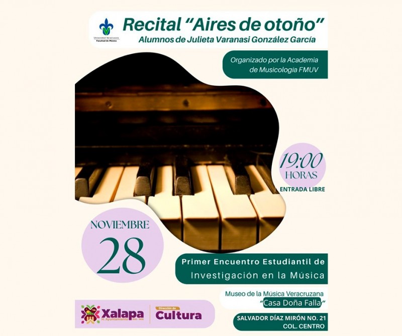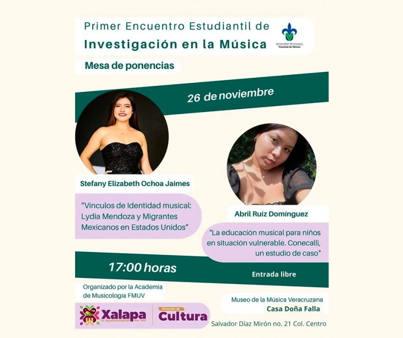 El miércoles, a las 17:00 horas, continuarán las ponencias del Encuentro Estudiantil de Investigación en la Música; a las 19:00 horas, en el Museo de la Música Veracruzana se tendrá el concierto “Como un ave a cielo abierto”.