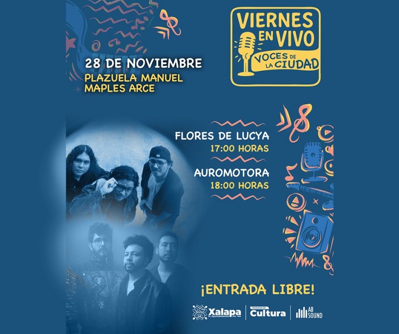 El viernes, a las 17:00 horas, en la plazuela “Manuel Maples Arce” se desarrollará “Voces de la ciudad: viernes en vivo”, con Flores de Lucya y Auromotora. A esta misma hora, en el Museo de la Música Veracruzana, continuará el Encuentro Estudiantil de Investigación en la Música.