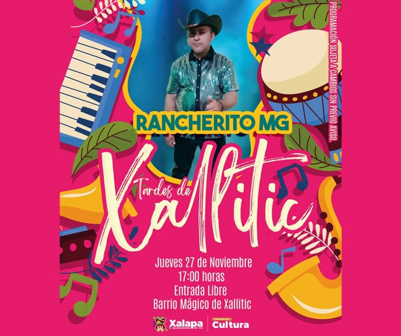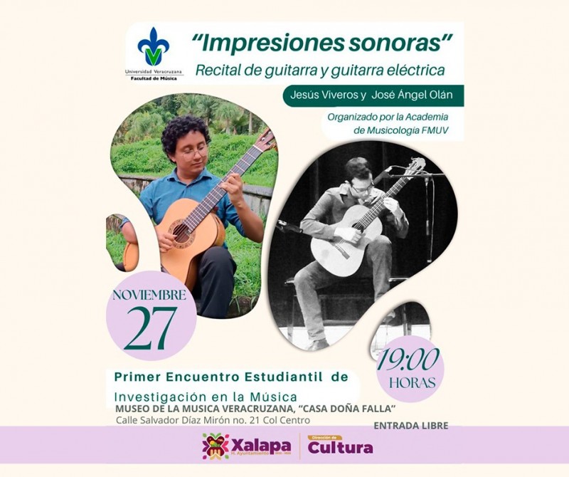 El jueves, a las 17:00 horas, en el Barrio Mágico de Xallitic se presentará Rancherito MG. A las 19:00 horas, en el Museo de la Música Veracruzana, se realizará el recital de guitarra eléctrica “Impresiones sonoras”, como parte del Primer Encuentro Estudiantil de Investigación en la Música.