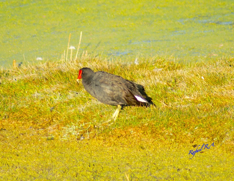 Gallareta frente rojo. Alcanza hasta 27n cm Cabeza y cuello negros mas intenso que el resto del cuerpo que es negruzco ceniciento, pico amarillo fuerte terminando en rojo intenso.