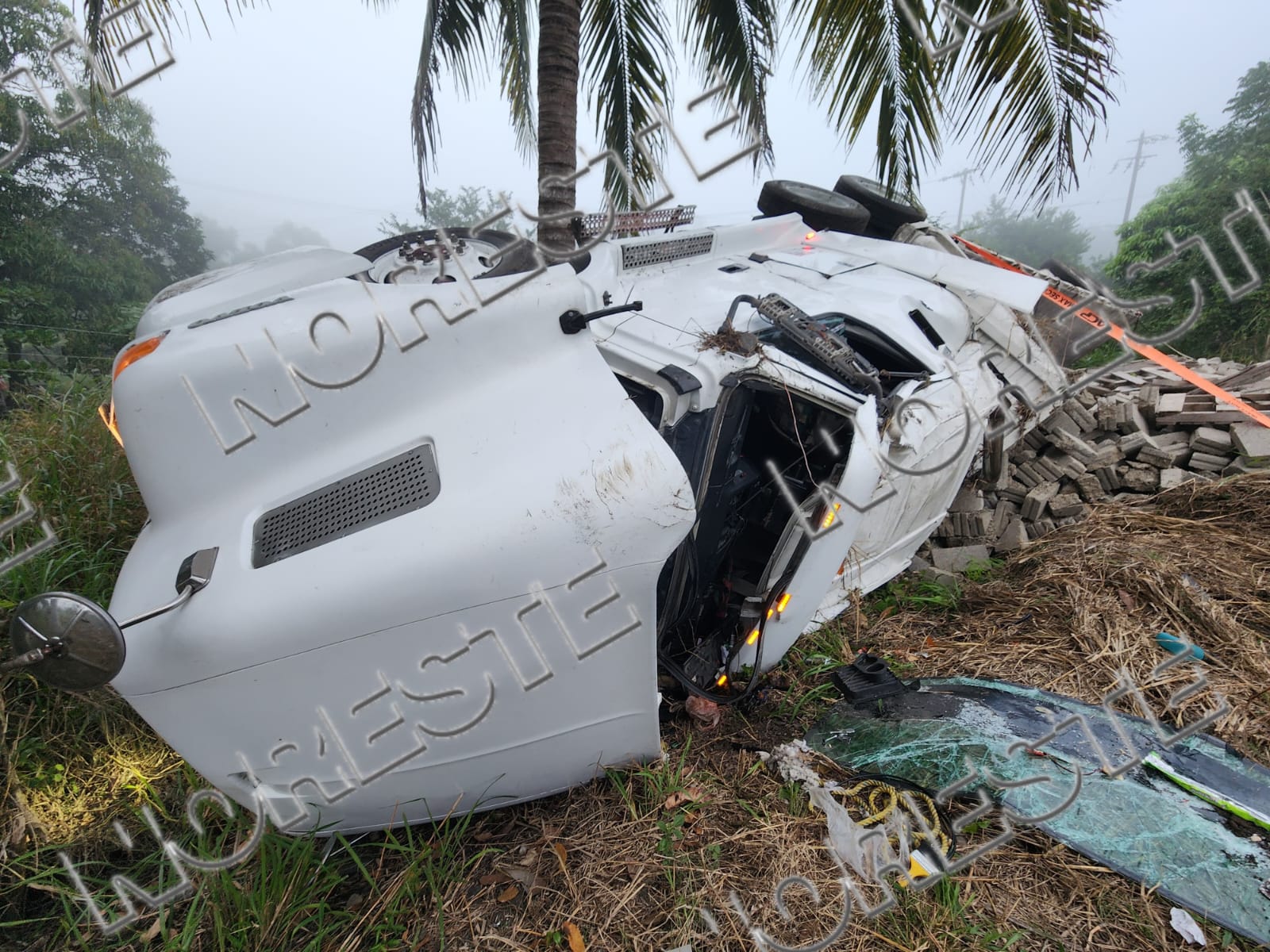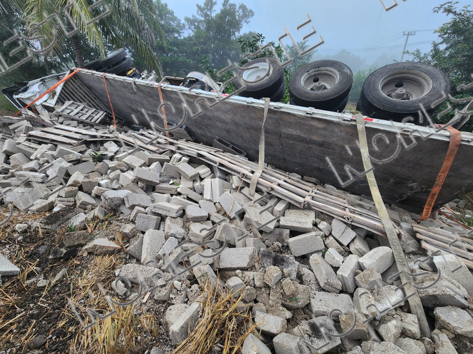 Un aparatoso accidente se registró la mañana de este martes en la carretera El Chote–Poza Rica, a la altura de la empacadora de limones del Tajín, donde un tráiler cargado con 4 mil blocks terminó volcado tras una maniobra fallida. El conductor, identificado como Antonio Esquivel Reyes, resultó policontundido pero logró salir con vida de entre los fierros retorcidos.