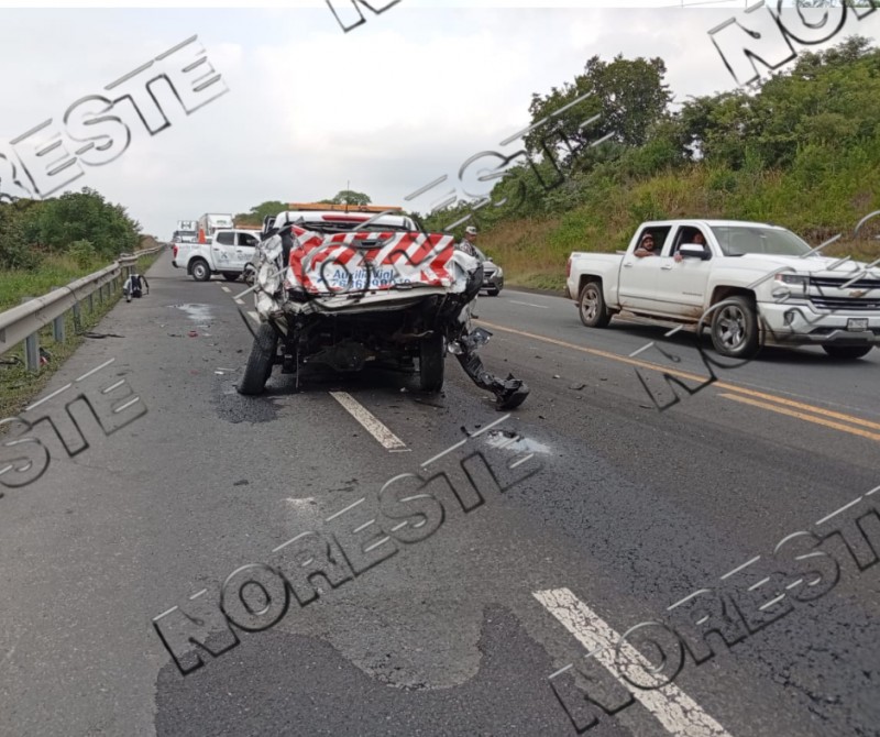 Un aparatoso accidente ocurrido en el kilómetro 20 de la autopista Tuxpan–Tampico dejó cuantiosos daños materiales y una persona herida, esto luego de que un tráiler cargado con vidrio y cartón chocara contra una camioneta de auxilio vial y terminara envuelto en llamas.
