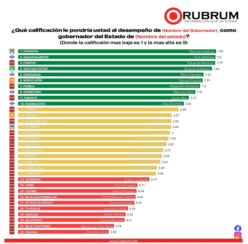 De acuerdo con la más reciente medición de la encuestadora Rubrum, correspondiente a la Evaluación de Gobernadores, la mandataria veracruzana Rocío Nahle García se consolida como la gobernadora número 15 mejor evaluada a nivel nacional, reafirmando el respaldo ciudadano hacia su administración a poco más de un año de iniciar su gestión.