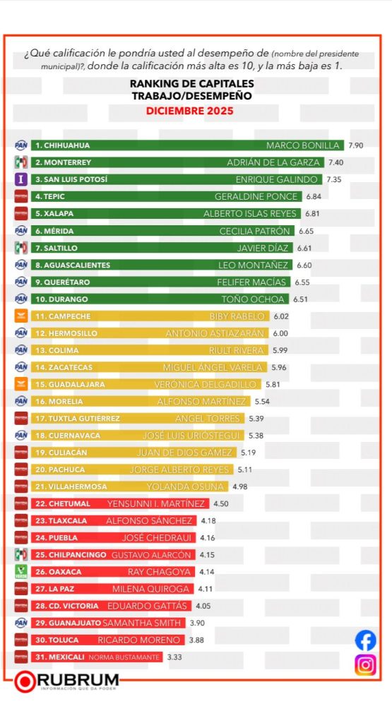 Así lo revela la encuesta “Las 31 capitales estatales”, realizada por la empresa RUBRUM, que se publica este 8 de diciembre.
