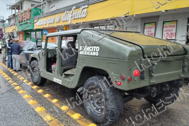 El incidente ocurrió a la altura de las calles Xicoténcatl y Vicente Guerrero, en la zona centro, cuando un Hummer castrense, identificado con el número 08931032, terminó impactando en la parte trasera a un Chevrolet Aveo gris con matrícula estatal.