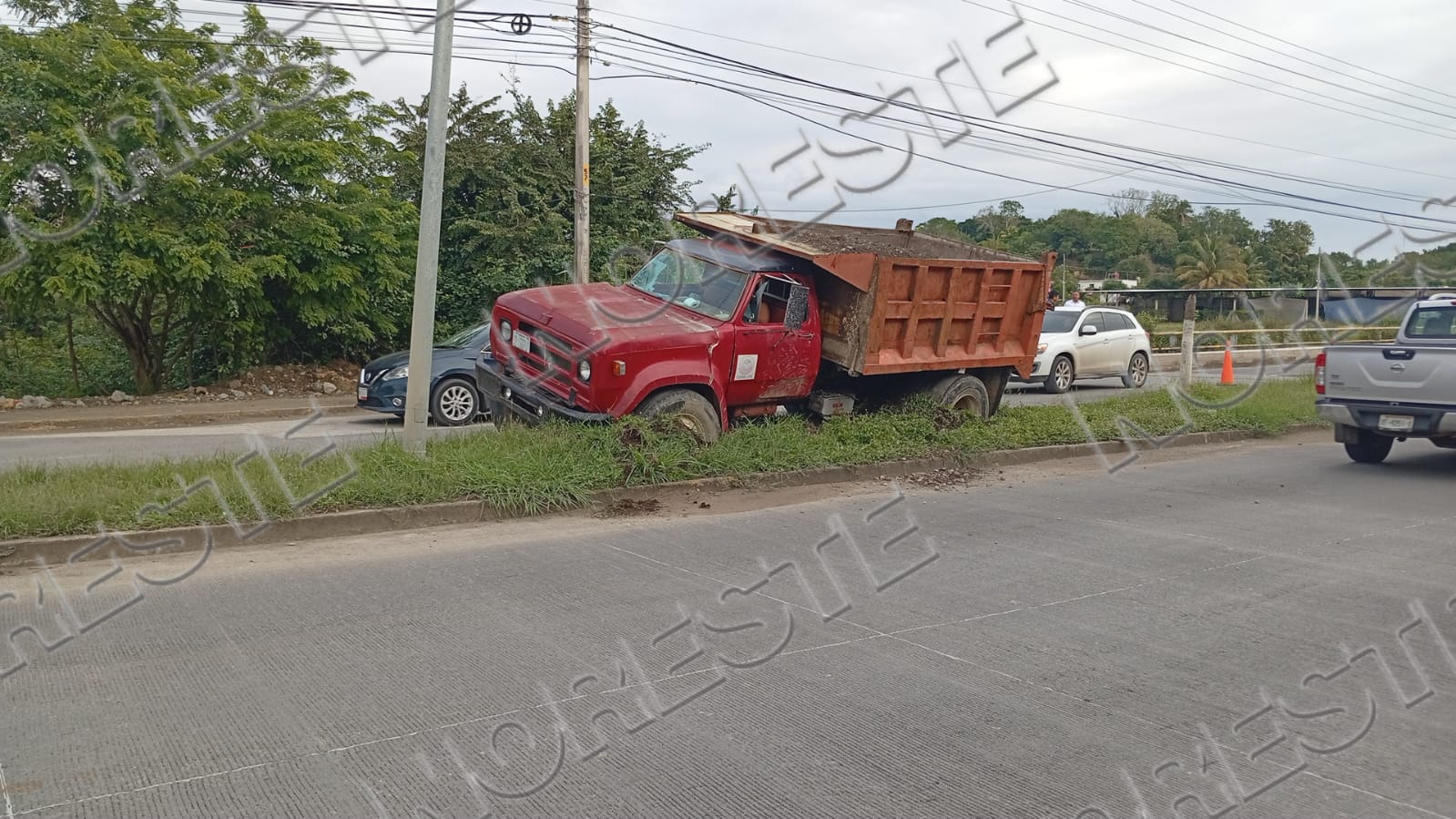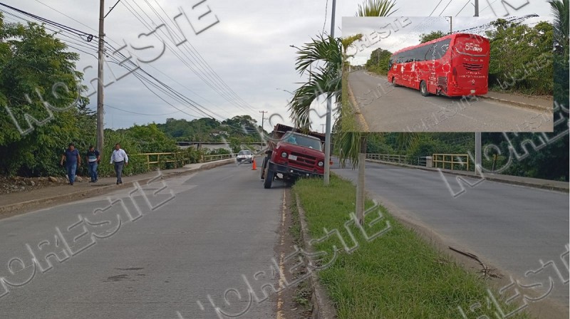 Un fuerte percance vial dejó cuantiosos daños materiales luego de que un camión cargado con grava fuera embestido por un autobús de la línea ADO, situación que provocó que la pesada unidad terminara proyectada contra la estructura de un puente y subida sobre el camellón central. Afortunadamente, no hubo personas lesionadas.
