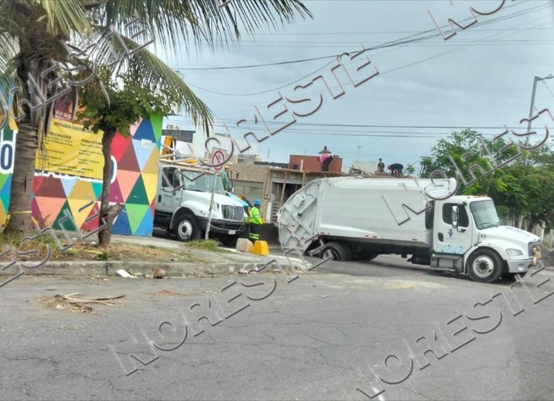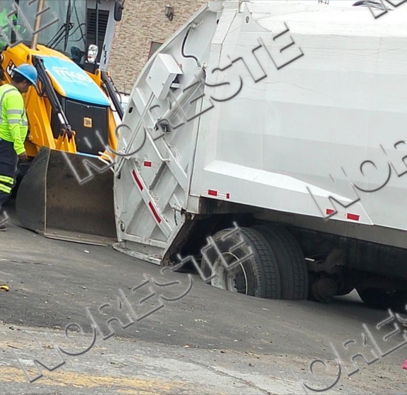 Un camión recolector de basura del Ayuntamiento de Veracruz terminó atorado en un socavón la tarde de este martes, luego de que el pavimento cediera mientras la unidad circulaba por la avenida Matamoros, en la esquina con Arrillaga, en la colonia Pinos.