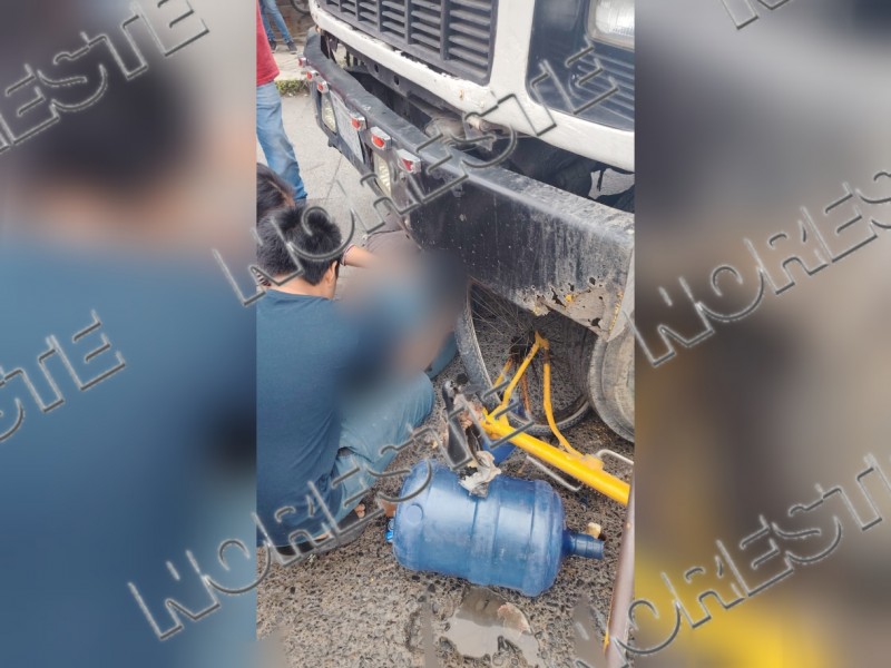 Un comerciante dedicado a la venta de agua en garrafón terminó con diversas heridas luego de ser atropellado por un camión de volteo mientras se desplazaba empujando un triciclo, en la colonia Los Pinos.