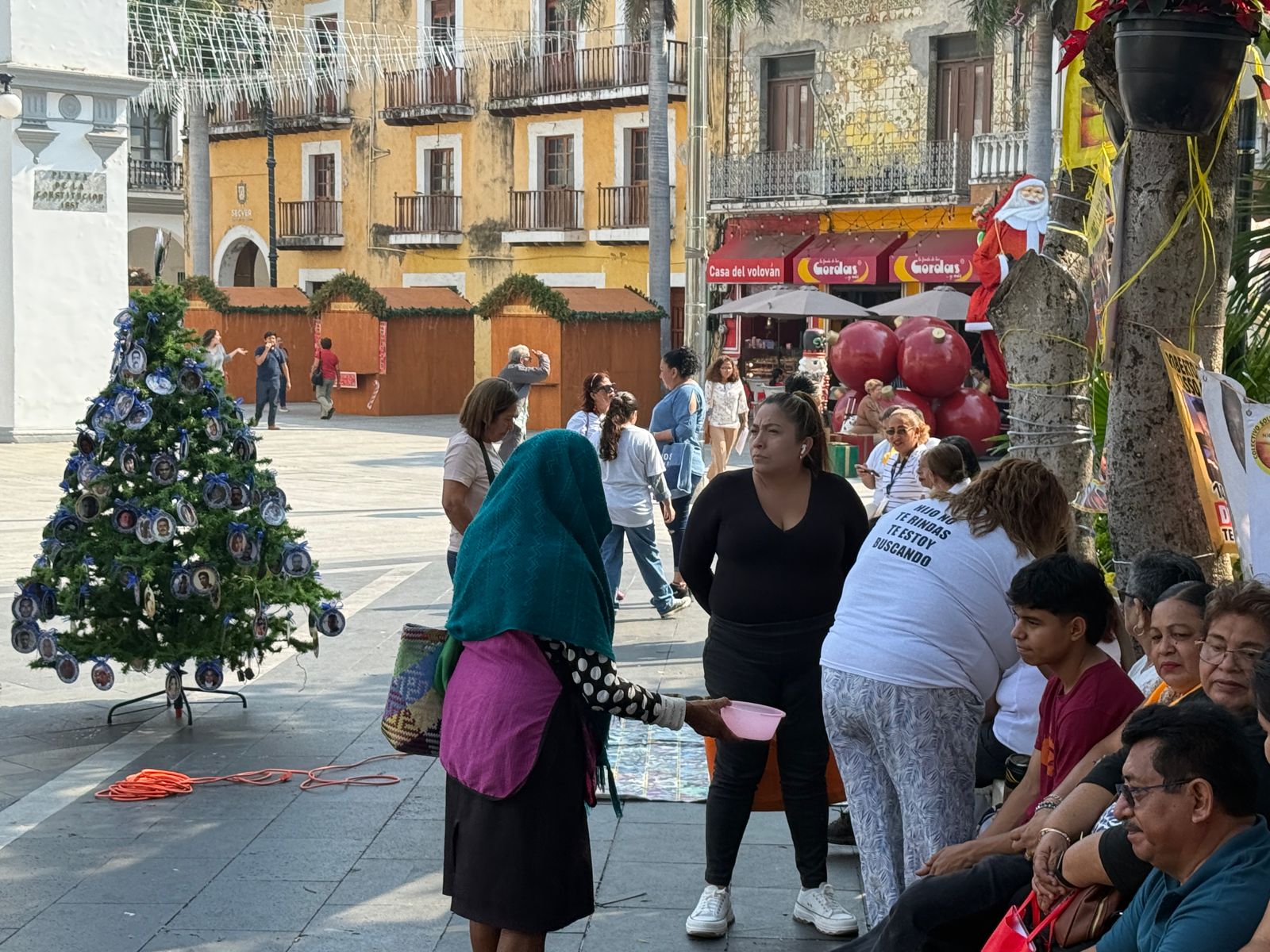 El pino navideño fue adornado con decenas de esferas que contienen los rostros de hombres y mujeres ausentes, una representación simbólica del vacío que persiste en cientos de familias veracruzanas.