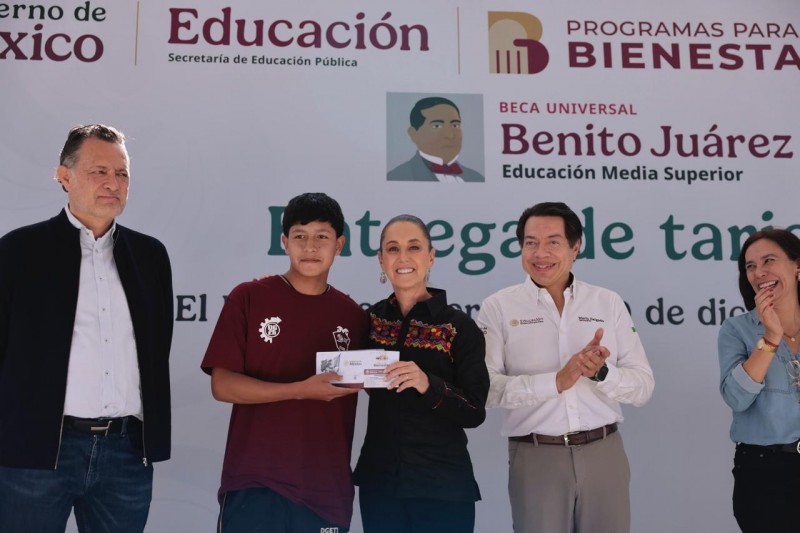 En Querétaro, la Presidenta de México, Claudia Sheinbaum Pardo, encabezó la entrega de tarjetas de la Beca Universal para la Educación Media Superior “Benito Juárez” y supervisó la construcción del nuevo Centro de Bachillerato Tecnológico Industrial y de Servicios (CBTIS) No. 304, en el municipio de El Marqués, que tiene un 90 por ciento de avance y estará listo el 27 de diciembre para ser inaugurado en febrero, y con ello cumplir el sueño de que las y los jóvenes vayan a la preparatoria y accedan a la educación como un derecho.
