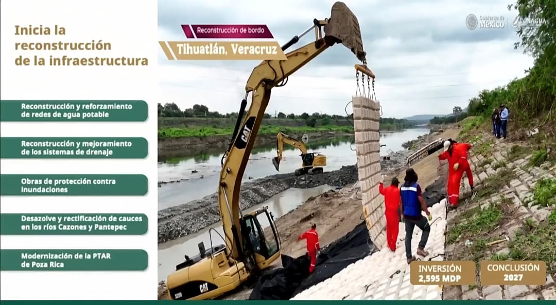 Se informó que este esfuerzo se complementa con el programa de reconstrucción de infraestructura hidráulica en Veracruz, que contempla 108 obras con una inversión de 2 mil 595 millones de pesos. Entre las acciones destacan la rehabilitación de redes de agua potable, drenaje, obras de protección contra inundaciones, desazolve y rectificación de los ríos Cazones y Pantepec, así como la modernización de la planta de tratamiento de aguas residuales de Poza Rica, actualmente fuera de operación.