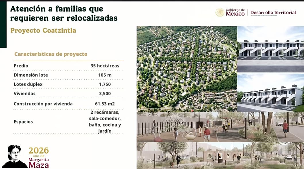 El desarrollo habitacional se edificará en un predio de 35 hectáreas e incluirá mil 750 lotes tipo dúplex, lo que permitirá la construcción de 3 mil 500 viviendas. Cada casa tendrá una superficie de construcción de 61.53 metros cuadrados, con dos recámaras, sala-comedor, baño, cocina y área de jardín, diseñadas para ofrecer condiciones dignas y seguras a las familias beneficiadas.