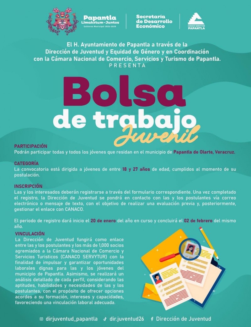 El Ayuntamiento de Papantla, a través de la Dirección de Juventud y Equidad de Género, y en coordinación con la Cámara Nacional de Comercio, Servicios y Turismo (CANACO), invita a las y los jóvenes a formar parte de la Primera Bolsa de Trabajo Juvenil, una iniciativa que busca generar oportunidades laborales dignas para este sector de la población.