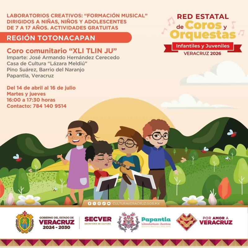 La llegada de la Red Estatal de Coros y Orquestas a Papantla representa una oportunidad para que niñas, niños y jóvenes desarrollen su talento, disciplina y gusto por la música, integrándose a un espacio formativo que impulsa la convivencia y abre puertas a futuras presentaciones artísticas en la región.