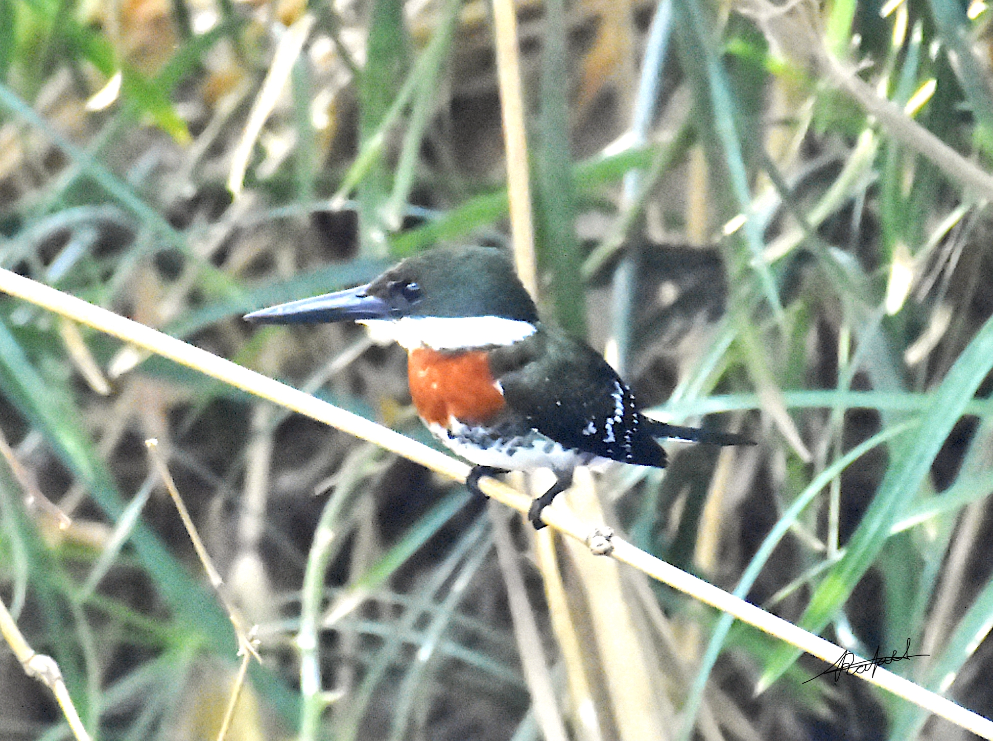 Martín pescador gigante. Mide entre 28 y 35 cm con una evergadura de 48 a 58 cm y de peso hasta 170 g.