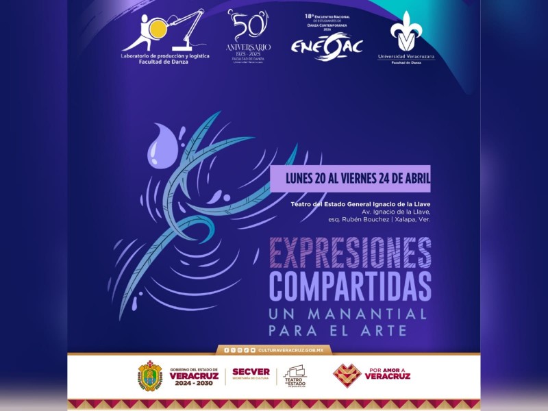 La Secretaría de Cultura de Veracruz (SECVER), en colaboración con la Facultad de Danza de la Universidad Veracruzana, invita al 18.º Encuentro Nacional de Estudiantes de Danza Contemporánea, que se llevará a cabo del 20 al 24 de abril, en el Teatro del Estado General Ignacio de la Llave. El acceso es gratuito con boleto de control.