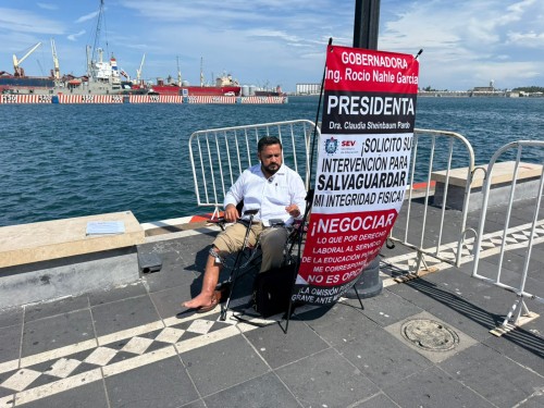 Maestro se encadena en Macroplaza del malecón de Veracruz por falta de pago de seguro