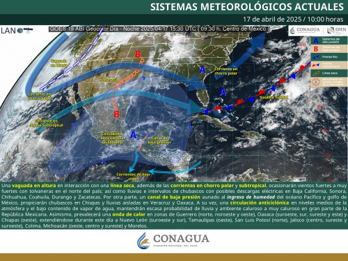 Por otra parte, un nuevo frente frío se aproximará a la frontera norte de México, generarsndo vientos fuertes a muy fuertes.