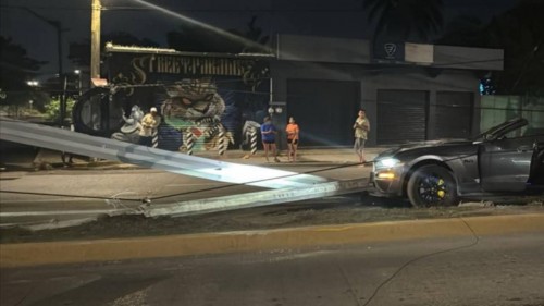 Conductor abandona lujoso Mustang tras derribar postes en la J. B. Lobos en Veracruz