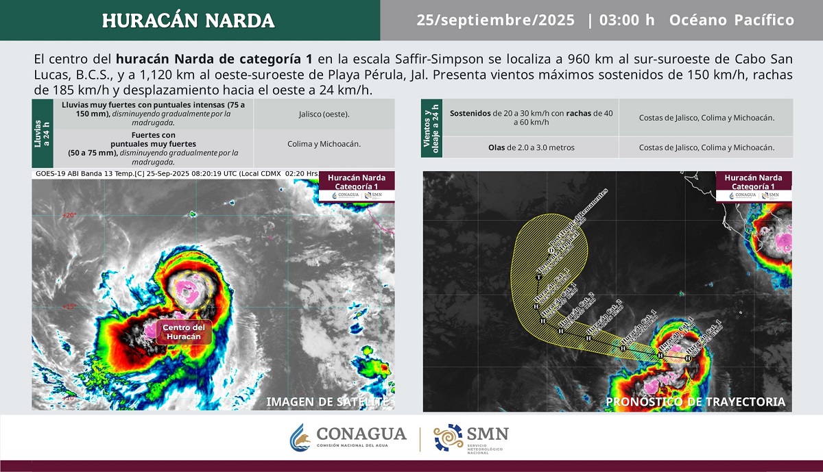 El huracán “Narda” se debilitó la madrugada del jueves 25 de septiembre de 2025 a categoría 1 en la escala Saffir-Simpson, aunque se espera que retome fuerza en las próximas horas, y sus desprendimientos nubosos mantendrán lluvias muy fuertes y oleaje elevado en las costas de Jalisco, Colima y Michoacán, según el Servicio Meteorológico Nacional (SMN).