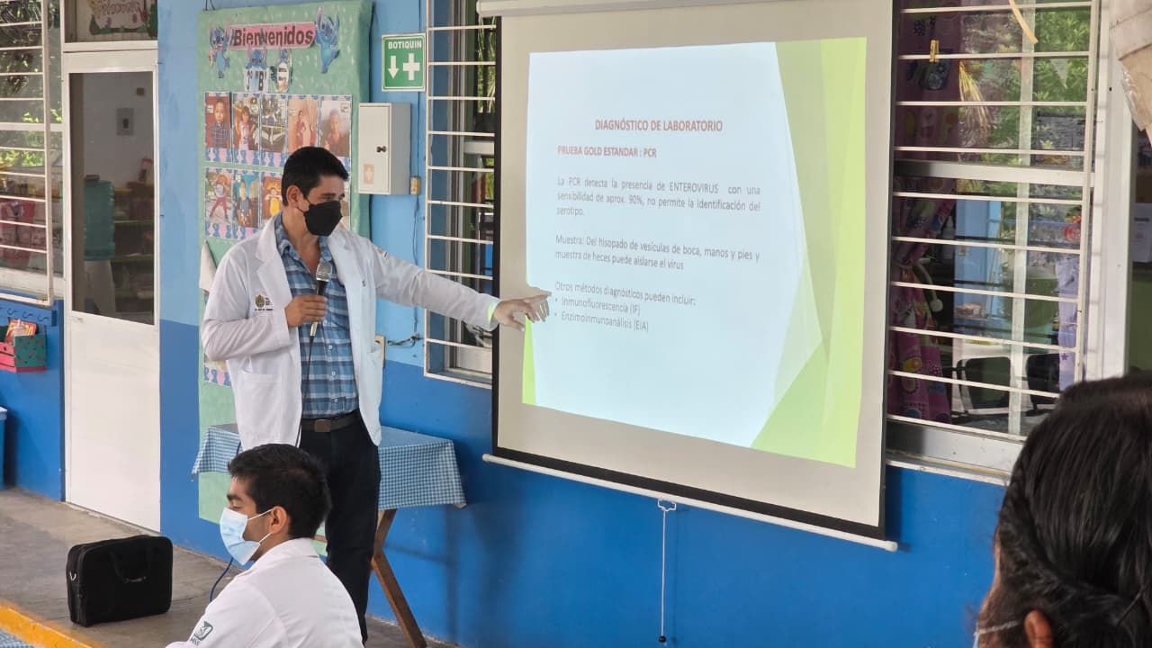 Representantes del Sector Salud sostuvieron una reunión con padres de familia del Jardín de Niños Libertad, ubicado en la colonia del mismo nombre, luego del brote del virus Coxsackie, causante de la enfermedad conocida como boca-mano-pie. De acuerdo con el doctor José Guadalupe Sánchez, se trata de un virus estacional típico del verano y el otoño, altamente contagioso, pero que no genera consecuencias graves en la mayoría de los pacientes.