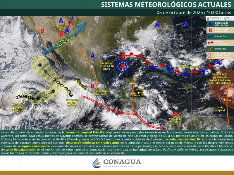 El huracán Priscilla del océano Pacífico se desplazará lentamente frente a las costas de Colima y Jalisco, con trayectoria hacia la costa occidental de Baja California Sur, su circulación y desprendimientos nubosos generarán lluvias puntuales intensas en Jalisco, Colima, Michoacán y Guerrero, además de lluvias fuertes en Baja California Sur, Sinaloa y Nayarit; asimismo, se pronostican rachas de viento de 70 a 90 km/h y oleaje de 5.0 a 6.0 metros de altura en las costas de Jalisco y Colima; viento con rachas de 50 a 70 km/h y oleaje de 3.0 a 4.0 metros en la costa de Michoacán; y rachas de viento de 40 a 50 km/h con oleaje de hasta 3.0 metros de altura en las costas de Baja California Sur (sur), Sinaloa, Nayarit y Guerrero.