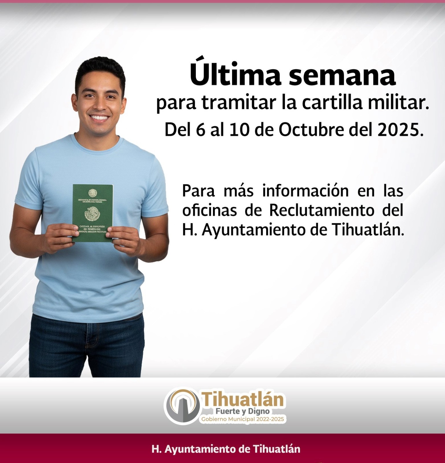 Menciono que, este año la Secretaría de la Defensa Nacional otorgo al Ayuntamiento de Tihuatlán 342 cartillas, de las cuales a la fecha solo quedan 30, de ahí la invitación a los jóvenes que les corresponde realizar esta obligación para que se acerquen en las oficinas de reclutamiento.