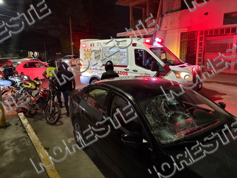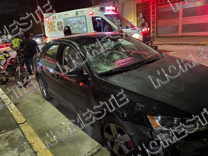 Un accidente vehicular se registró sobre la calle Pozo 13, donde una motocicleta Itálika FT 150 de color rojo, con placas del estado de Veracruz, fue impactada por un automóvil Volkswagen Jetta también con placas veracruzanas, luego de que este último presuntamente cortara la circulación al intentar incorporarse a la calle Fresno.