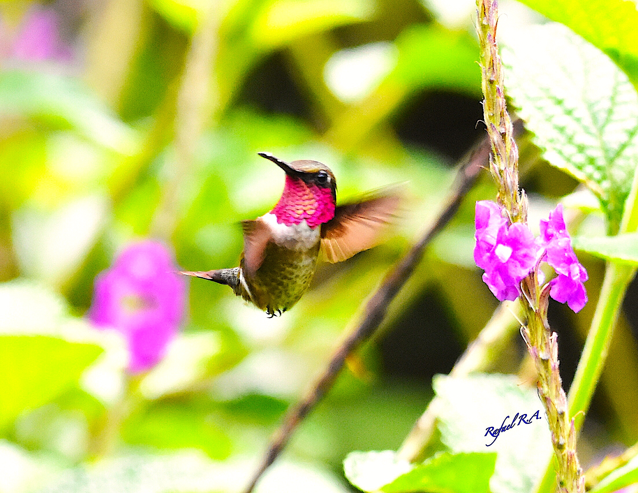 Mide de 6 a 7 cm. Pico negro y recto, el macho con cola ligeramente ajoprqiuillada, las partes superiores color verde bronce con una delgada linea blanca detrás del ojo, barbilla y garganta color ojo brillante o rosa intenso el pecho color café canela, patas grises; la hembra muy semejante, con sus partes inferiores en tono beige. Se le encuentra desde los Andes al suroeste de Colombia y hasta el norte de Perú.