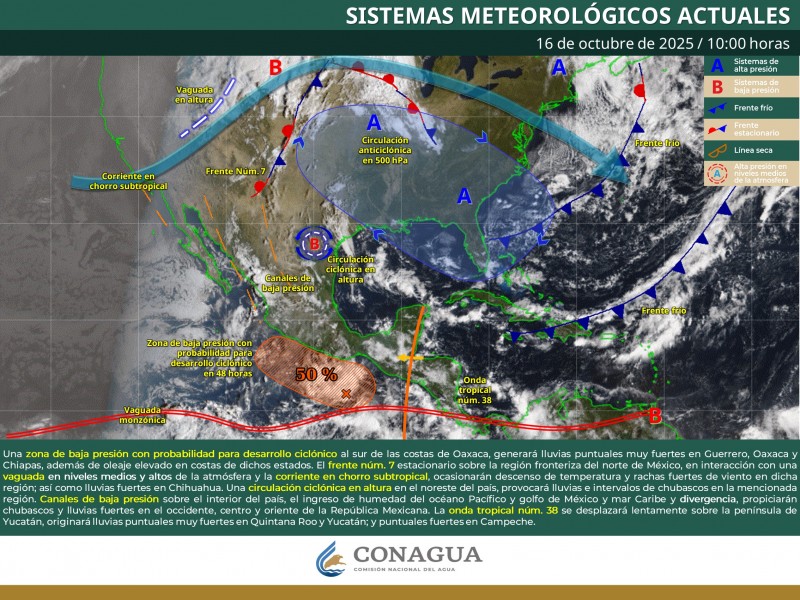El ingreso de humedad del océano Pacífico favorecido por una zona de baja presión con probabilidad para desarrollo ciclónico frente a costas del Pacífico sur mexicano, generará lluvias muy fuertes en Guerrero y Oaxaca, además de oleaje elevado en la costa de Oaxaca.