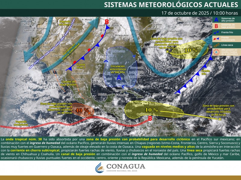 El ingreso de humedad del océano Pacífico favorecido por la cercanía de la vaguada monzónica y de la zona de baja presión con probabilidad para desarrollo ciclónico frente a las costas del Pacífico sur mexicano, generarán lluvias puntuales intensas en Chiapas, así como lluvias muy fuertes en Oaxaca y Guerrero, además de oleaje elevado en las costas de los estados mencionados.
