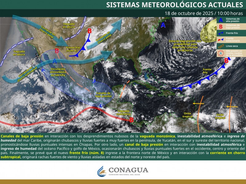 Canales de baja presión se extenderán sobre la península de Yucatán, el oriente y sureste de la República Mexicana, en interacción con una zona de baja presión con probabilidad de desarrollo ciclónico al sureste de las costas de Chiapas, los desprendimientos nubosos de la vaguada monzónica, próxima a las costas del Pacífico sur mexicano, además de divergencia, ocasionarán lluvias fuertes a muy fuertes en las regiones mencionadas, además del sur del país, pronosticándose lluvias puntuales intensas en zonas de Veracruz, Oaxaca, Chiapas, Tabasco y Campeche.