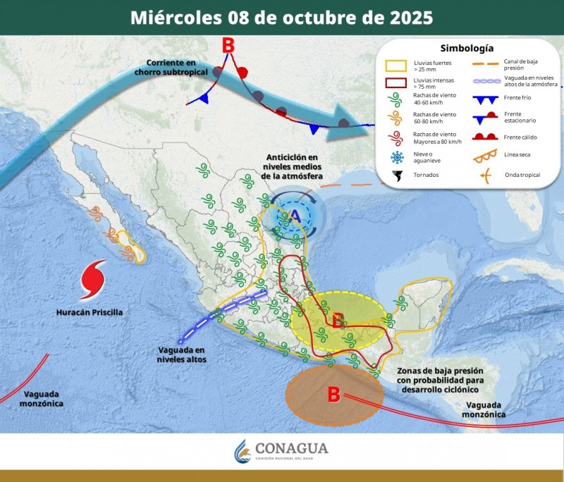 Estas condiciones son provocadas, principalmente, por una vaguada en la Sonda de Campeche, circulación del disturbio tropical #90 E del Pacífico y una circulación ciclónica en niveles altos de la atmósfera.