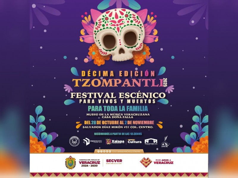La Secretaría de Cultura de Veracruz (SECVER) invita a la celebración del décimo aniversario del Festival Escénico Tzompantli, desde hoy y hasta el domingo 02 de noviembre a partir de las 18:30 horas.