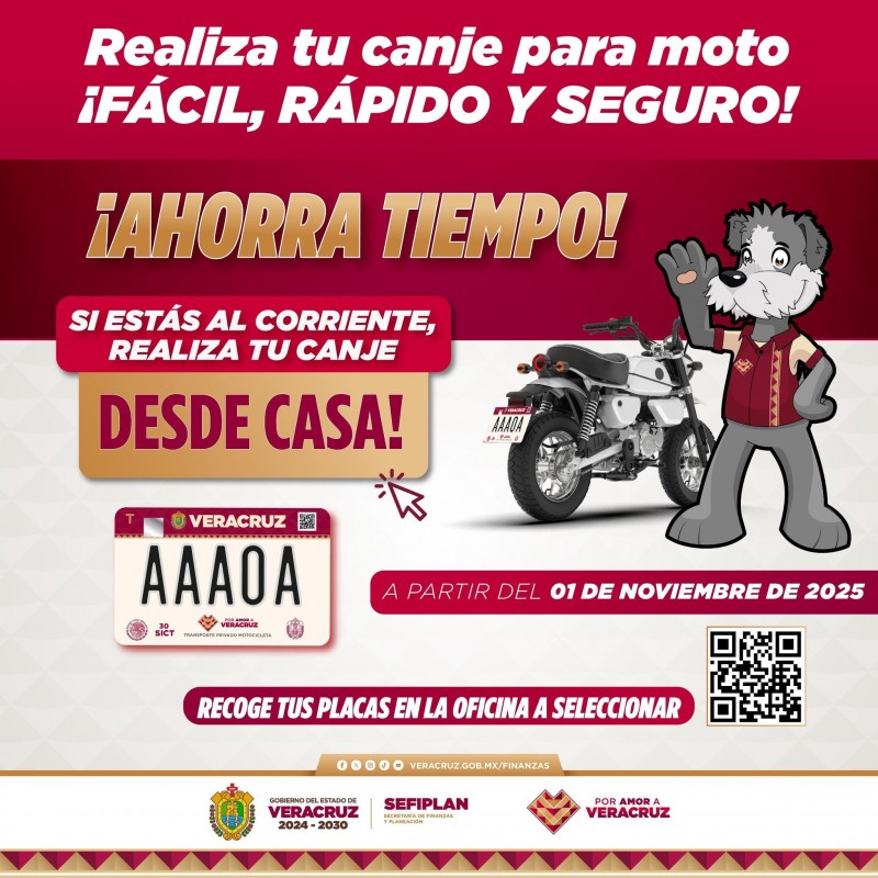 El Gobierno del Estado de Veracruz, a través de la Secretaría de Finanzas y Planeación, informa que, a partir de hoy está disponible el Canje de Placas para Motocicletas, como parte del programa de Dignificación y Modernización de las Oficinas de Hacienda del Estado.
